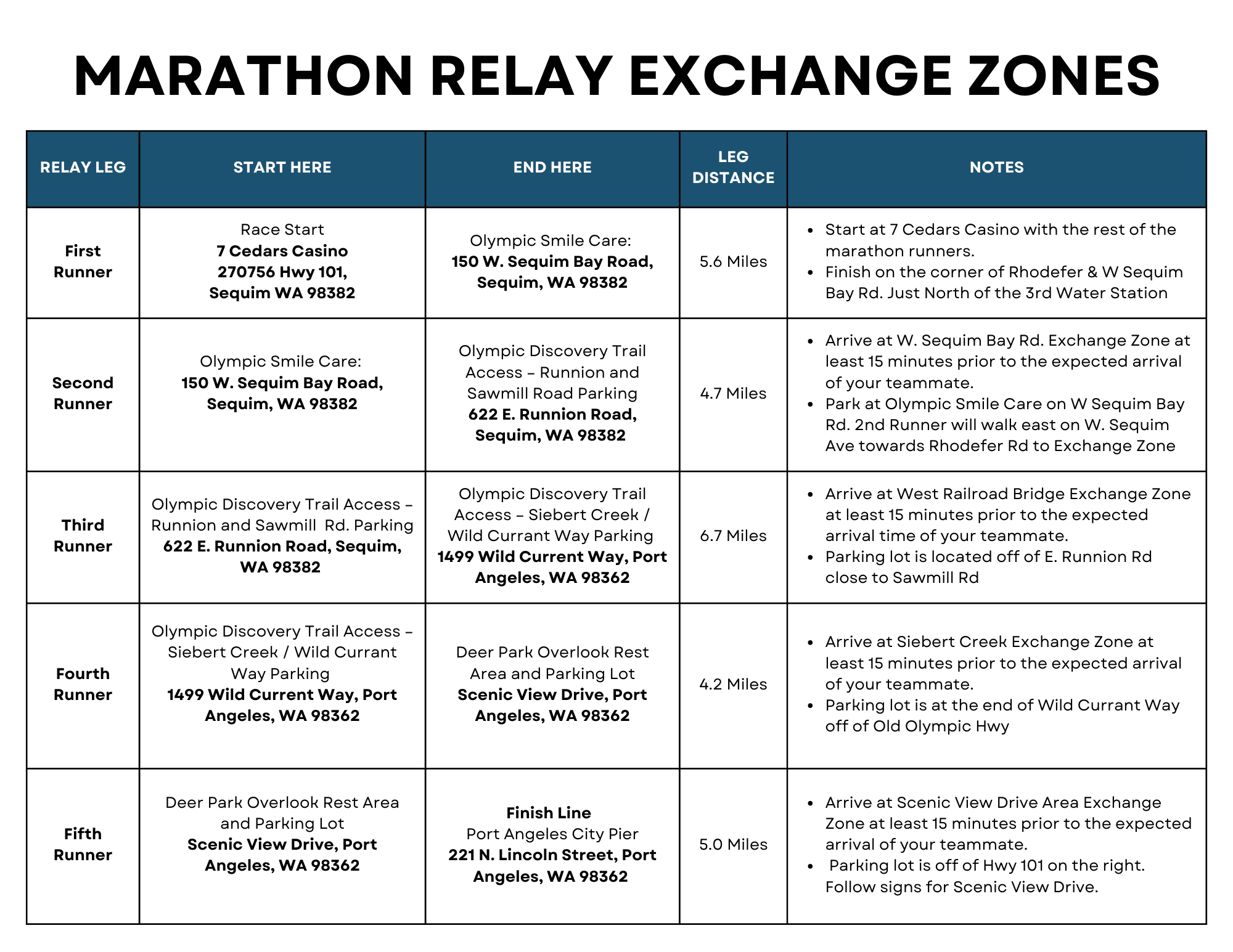 Team size can vary between 2-5 members. A 5 person team will run or walk legs between 4.2-6.7 miles. Smaller teams will divide the legs to meet their needs and will run longer distances. Four official exchange zone locations have been dedicated on the course map. Teams are responsible for their own transportation.