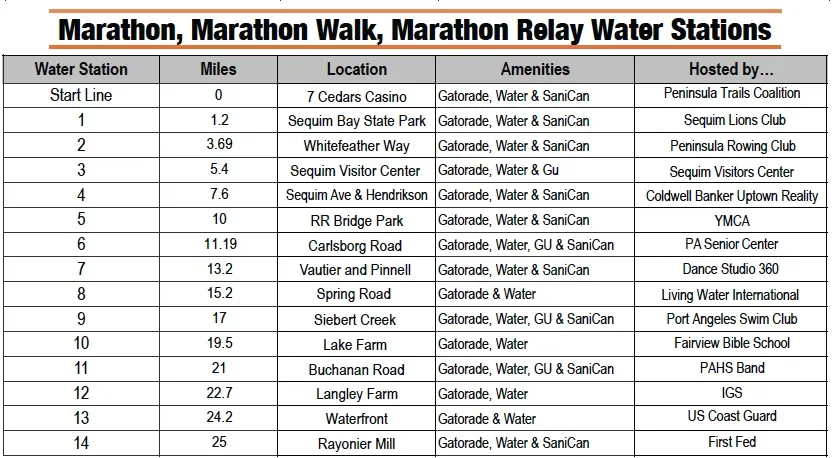 • There are 14 water stations located along the course, each stocked with water and Gatorade. Select stations also offer GU energy gels and other snacks. For more details on the exact locations and available supplies at each station, please refer to the chart above.
